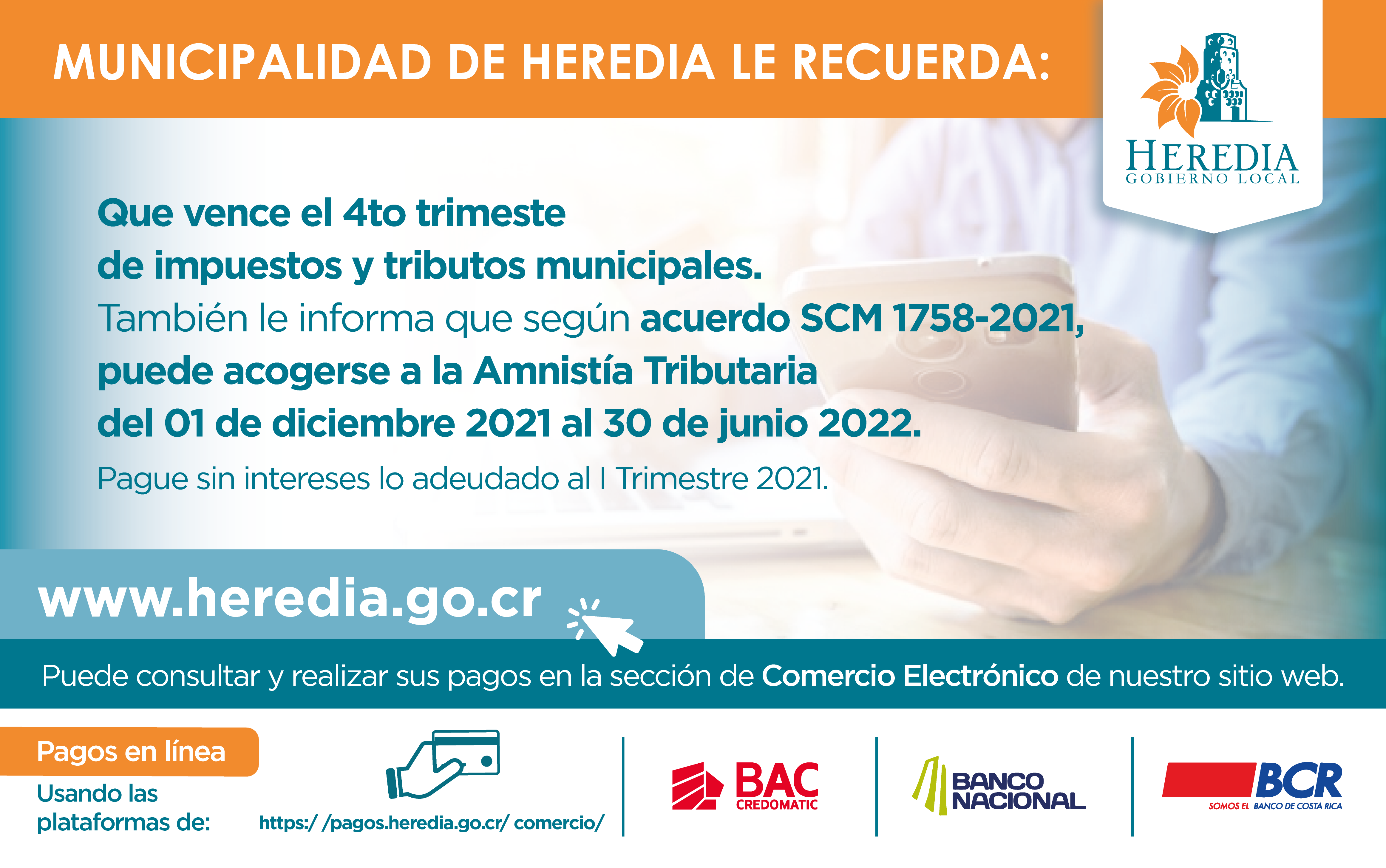 La Municipalidad de Heredia acordó acogerse a la amnistía tributaria a partir del 01 de diciembre de 2021 y hasta el 30 de junio del 2022, en Sesión Ordinaria N° 132-2021, celebrada por el Concejo Municipal el pasado 22 de noviembre.