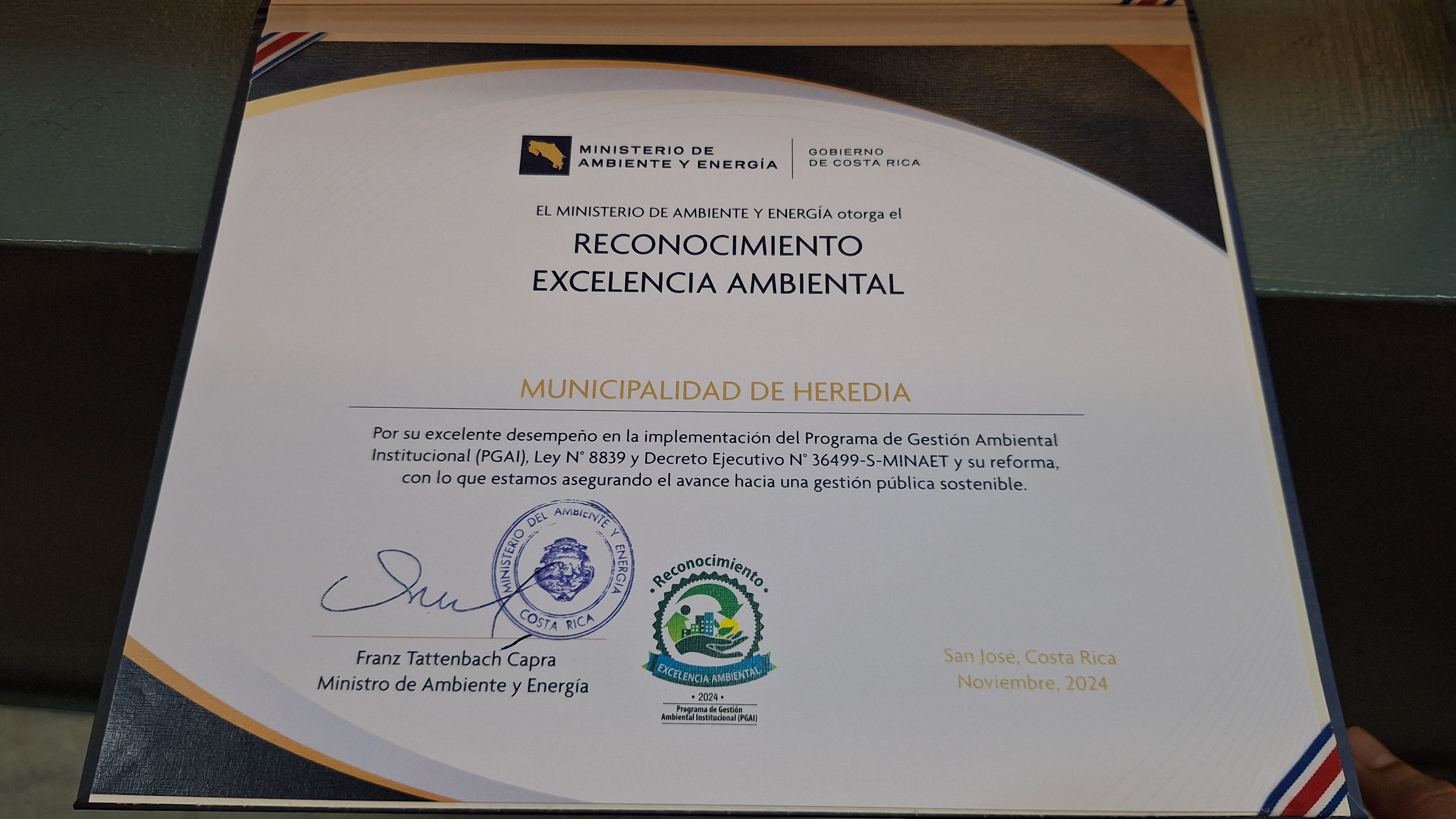 La Municipalidad de Heredia se enorgullece en anunciar que ha sido reconocida por su destacado desempeño en la implementación del Programa de Gestión Ambiental Institucional (PGAI), conforme a lo establecido en la Ley N° 8839 y el Decreto Ejecutivo N°36499-S-MINAET y su reforma.