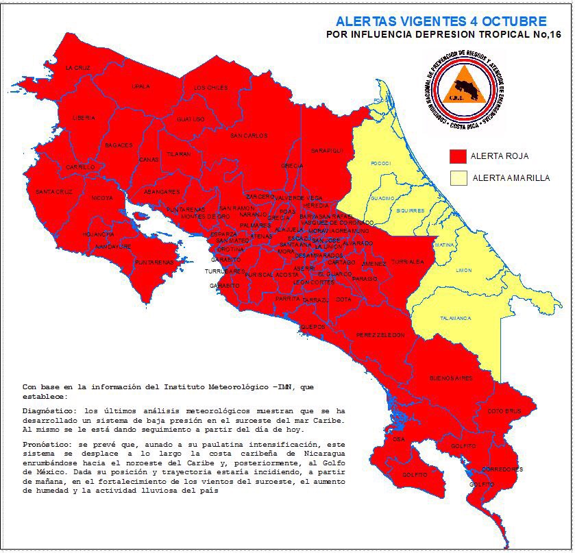 Según el informe N. 3 del Instituto Meteorológico Nacional (IMN) del 04 de octubre a las 9:30 horas en el cual indica que la Depresión Tropical N.16 se ha formado sobre el suroeste del Mar Caribe, localizándose a 280 km de Limón, con una velocidad de desplazamiento de 11 km/h y vientos sostenidos de 55 km/h. Ante esta situación, ya se presentan fuertes aguaceros en los Playas del Coco dejando un acumulado entre 30-60 mm en las últimas horas.