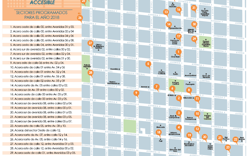- Acera oeste de calle 00, entre Avenidas 01 y 03 (100m de Acera de Trigo Miel, Soda Paco Alfaro y Cruz Roja. Sección contiene piedras Andesitas).