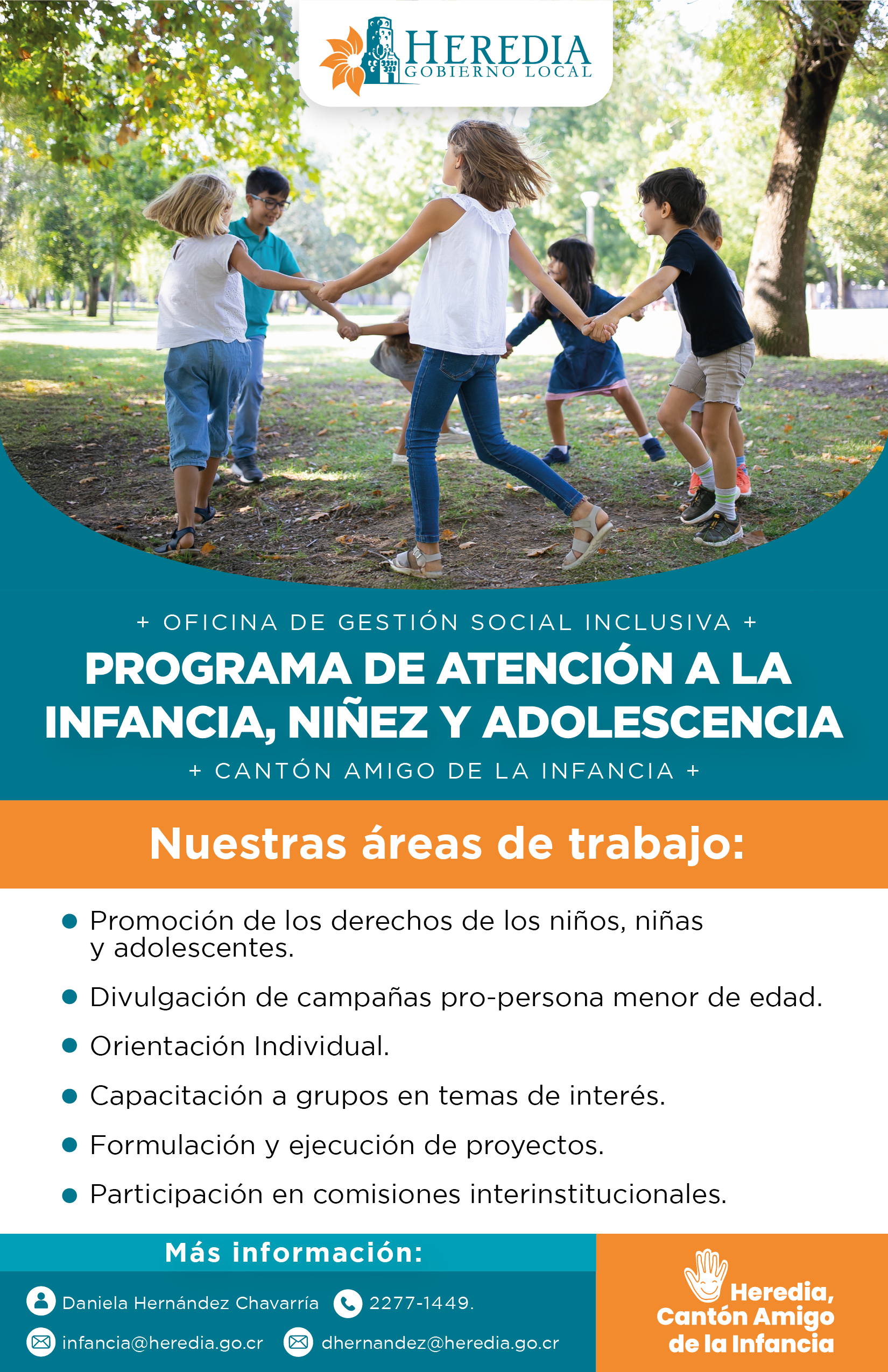 La Municipalidad de Heredia dentro de su quehacer ha incorporado el programa de atención a personas menores de edad, como parte de la Oficina de Gestión Social Inclusiva de la Dirección de Desarrollo Socioeconómico del Gobierno Local. El programa está a cargo de una profesional en Trabajo Social, misma que se dedica únicamente a la atención de esta población desde un enfoque de Derechos Humanos y desde la doctrina de protección integral.