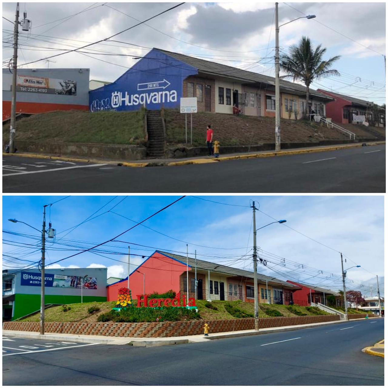 La Municipalidad de Heredia continúa para recuperando y remodelando los espacios públicos. Así luce hoy, una de las entradas a la ciudad de Heredia, específicamente en el sector conocido como "Casas Baratas". El proyectó consistió brindar accesibilidad total a las viviendas colindantes con esta área. La obra incluyó la construcción de muros de contención, sistema de canalización pluvial, aceras, rampas, gradas, reforestación de zonas verdes, iluminación led y colocación del Tótem con astas de banderas