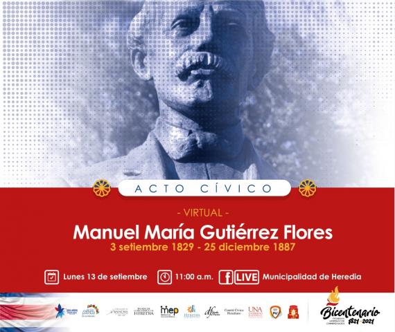 La Comisión del Bicentenario les invita a participar del acto cívico virtual Manuel María Gutiérrez el cual será transmitido el lunes 13 de setiembre a las 11:00 a.m. desde el Facebook de la Municipalidad de Heredia.