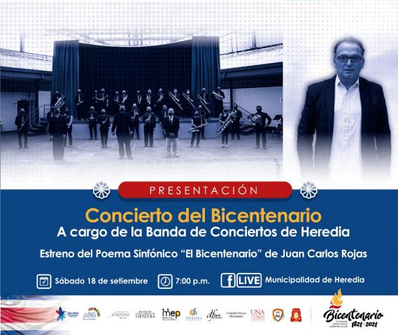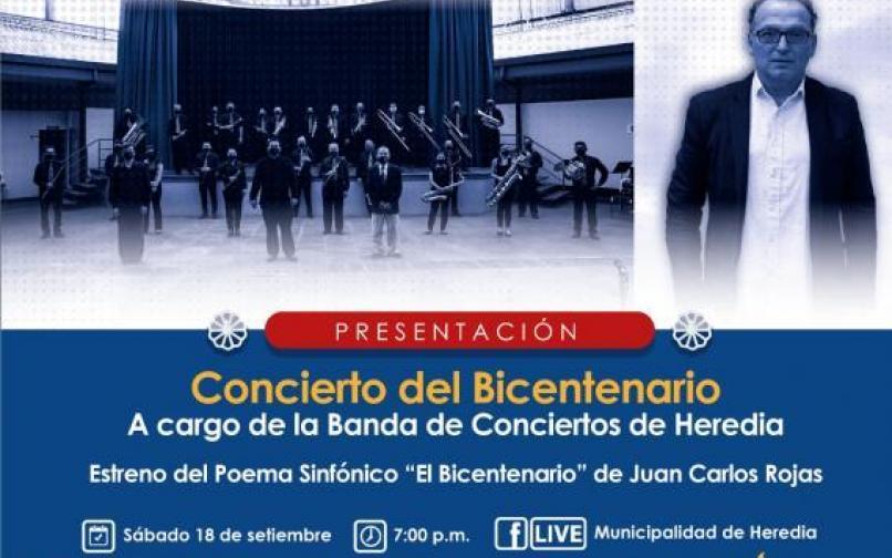 La Comisión del Bicentenario, les invita al Concierto del Bicentenario con la Banda de Conciertos de Heredia y la presentación del Poema Sinfónico "El Bicentenario" de Juan Carlos Rojas a través del Facebook Live de la Municipalidad de Heredia.