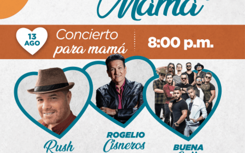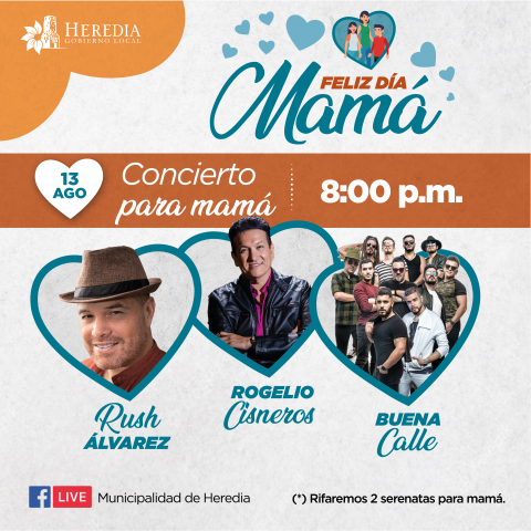 La reconocida banda Buena Calle; una de las voces más hermosas del país Rogelio Cisneros; así como, el talentoso Rush Álvarez, unidos por la Municipalidad de Heredia, quienes tienen preparado un concierto único para todas las madres, al que han titulado “Festival para Mamá”. Dicho espectáculo cuenta con el talento de estos grandes artistas, acompañados por músicos de alta calidad e interpretando un selecto repertorio que harán de este evento una gran opción para disfrutar, compartir y llenarnos de emoción con nuestras burbujas.