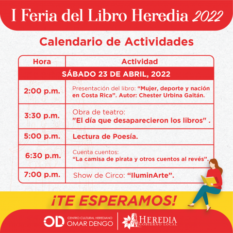 La Municipalidad de Heredia conmemora el Día del Libro con la Feria del Libro Heredia 2022, misma que reunirá editoriales, librerías y escritores en el Centro Cultural Herediano Omar Dengo los días 22, 23 y 24 de abril.