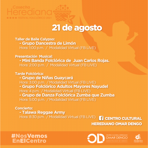 El Centro Cultural Herediano Omar Dengo tiene el agrado de invitarlos a disfrutar del III Festival Folclórico Cosecha Herediana, 2021 del 20 al 22 de agosto, 2021, dedicado al Profesor Reinaldo Ramírez Muñoz.