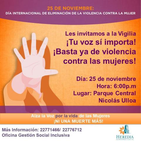 En el marco de la conmemoración del Día Internacional para la Eliminación de la Violencia contra las Mujeres, el Gobierno Local invita a la comunidad herediana a participar de las diversas acciones que ha preparado para sensibilizar sobre esta temática como La Marcha y la Vigilia ¡Tu voz sí importa!. La violencia machista tiene muchas manifestaciones, siendo la más extrema la muerte de una mujer por ser mujer. Nos sumamos a los esfuerzos que realizan en esta fecha las instituciones y organizaciones de la sociedad civil para erradicar todas las formas de violencia.