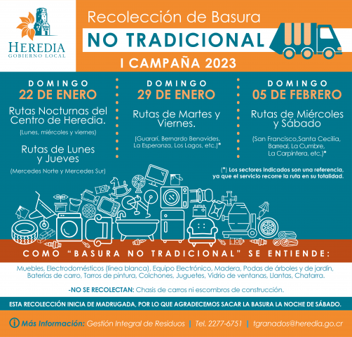 Se refiere al Servicio Municipal de Recolección de residuos de manejo especial, conocidos como “no tradicionales” que se brinda una vez por trimestre en todo el Cantón. Este servicio se brinda en días domingo iniciando de madrugada, y las rutas coinciden con las rutas normales de recolección. Las fechas se informan por diferentes medios masivos y se publican por redes sociales y páginas web, por lo que el administrado debe estar atento a esta información.