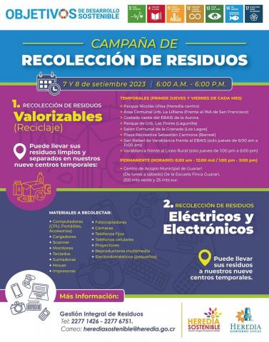 La Municipalidad de Heredia informa que los servicios de recolección de residuos valorizables y electrónicos. Para más información en: https://herediasostenible.heredia.go.cr/