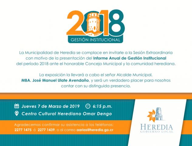 Sesión del Concejo Muniicpal donde el Alcalde Municpal, José manuel Ulate Avendaño presenta a éste cuerpo colegiado y al la ciudadnía en general su Informe de Gestión Municipal del año 2018.