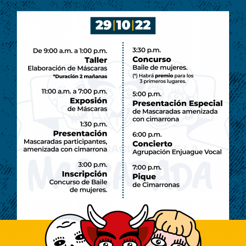 Las actividades se realizarán en el Centro Cultural Herediano Omar Dengo y se extenderán durante todo el fin de semana, son gratuitas y están dirigidas a todas las familias heredianas, entre ellas habrá concursos, baile, talleres, pique de cimarronas exposiciones de máscaras y presentaciones de mascaradas.