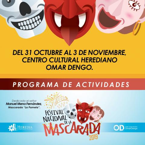 El Festival Nacional de la Mascarada tiene como objetivo principal celebrar el Día Nacional de la Mascarada Costarricense y ofrecer siempre a la comunidad Herediana actividades para el disfrute de la familia y el rescate de una de las tradiciones costarricenses más llamativas.