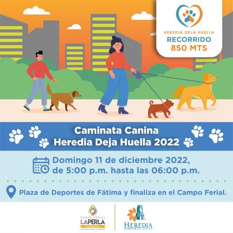 La Municipalidad de Heredia se complace en extender la invitación a la tercera edición de la “Caminata Canina Heredia Deja Huella 2022”, que se realizará a partir de las 4:00p.m., este domingo 11 de diciembre saliendo de la Plaza de deportes de Fátima, hacia el Campo Ferial la Perla en Mercedes Norte.