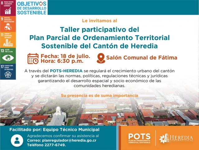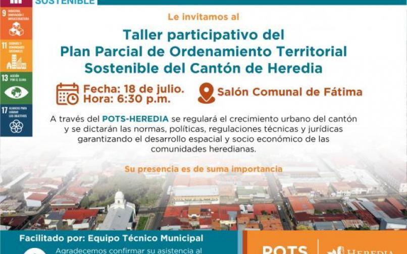 Estimada comunidad herediana, la Municipalidad de Heredia les invita a ser parte del proceso de ordenamiento territorial del cantón; sumándose a los talleres participativos del plan regulador de su comunidad.