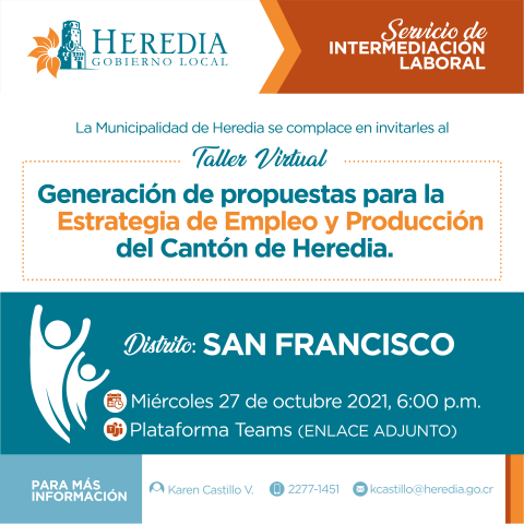 La Municipalidad de Heredia se complace en invitarles al taller virtual "Generación de propuestas para la Estrategia de Empleo y Producción del Cantón de Heredia" que se desarrollen en cada distrito en los próximos años y sean contempladas en los planes de desarrollo de mediano y largo plazo del Gobierno Local.