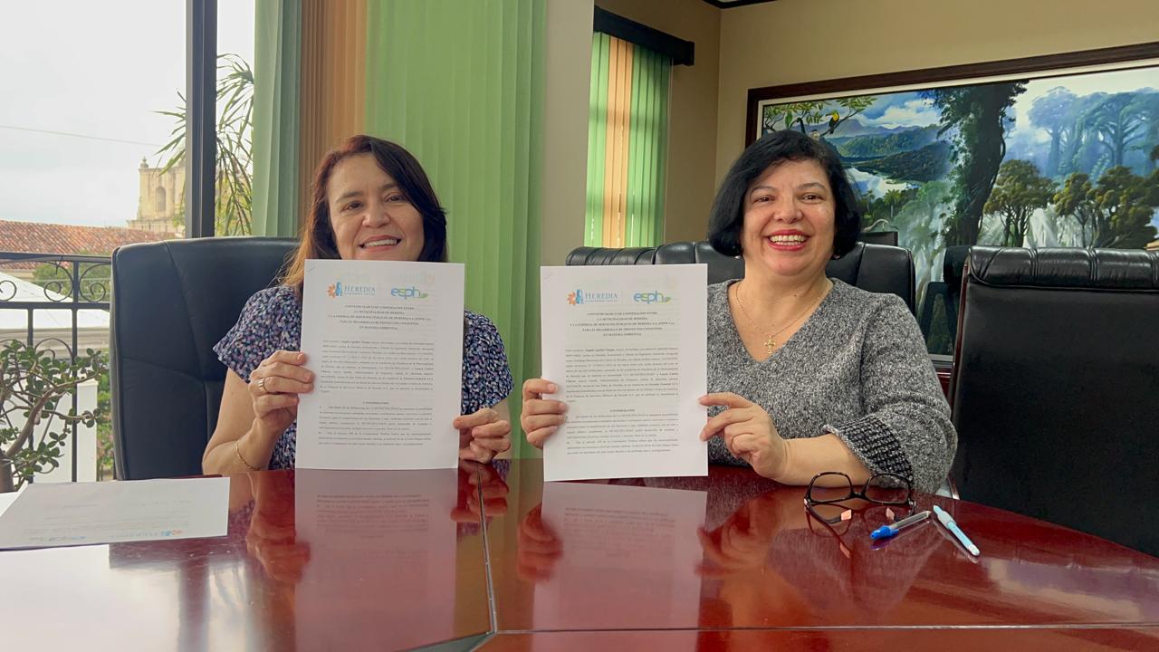 La Sra. Ángela Aguilar Vargas, alcaldesa de la Municipalidad de Heredia y la Sra. Laura Castro Chaves, Gerente General A.I. de la Empresa de Servicios Públicos de Heredia S.A. (ESPH S.A.) suscribieron un Convenio Marco de Cooperación con el objetivo de establecer una alianza estratégica que permita impulsar proyectos conjuntos en materia ambiental dentro del cantón de Heredia.