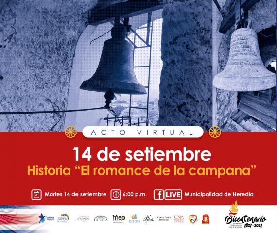 La Comisión del Bicentenario les invita a participar del Acto Virtual, Historia "El romance de la Campana" a través del Facebook Live de la Municipalidad de Heredia.